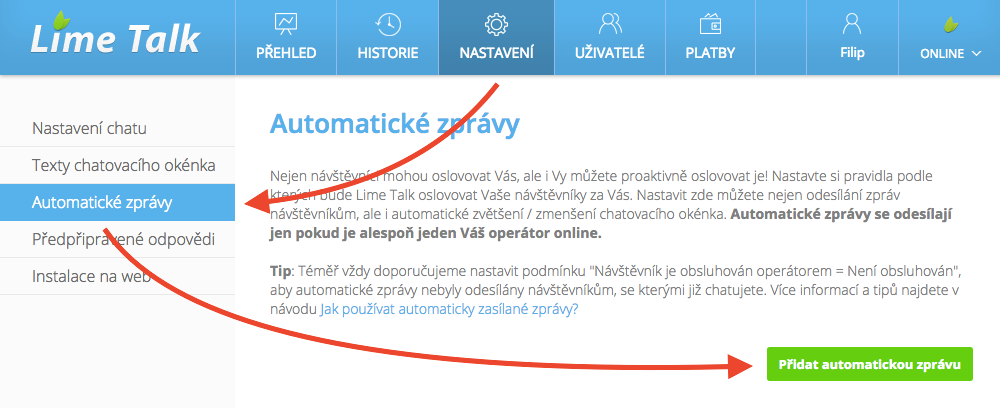 Nejdůležitější funkcí je zasílání zpráv návštěvníkům. Pod funkcí „Automatické zprávy“ se ale skrývá i možnost zvětšit či zmenšit chatovací okénko, případně zasílat upozornění Vašim operátorům (po splnění určitých podmínek můžete jen nechat upozornit operátora, který pak osloví návštěvníka sám). Funkcí je tedy více, ale v klientské zóně najdete vše pod názvem „Automatické zprávy“, a to v sekci „Nastavení“. Tam nastavujete co a v jakých podmínek za Vás má Lime Talk dělat.